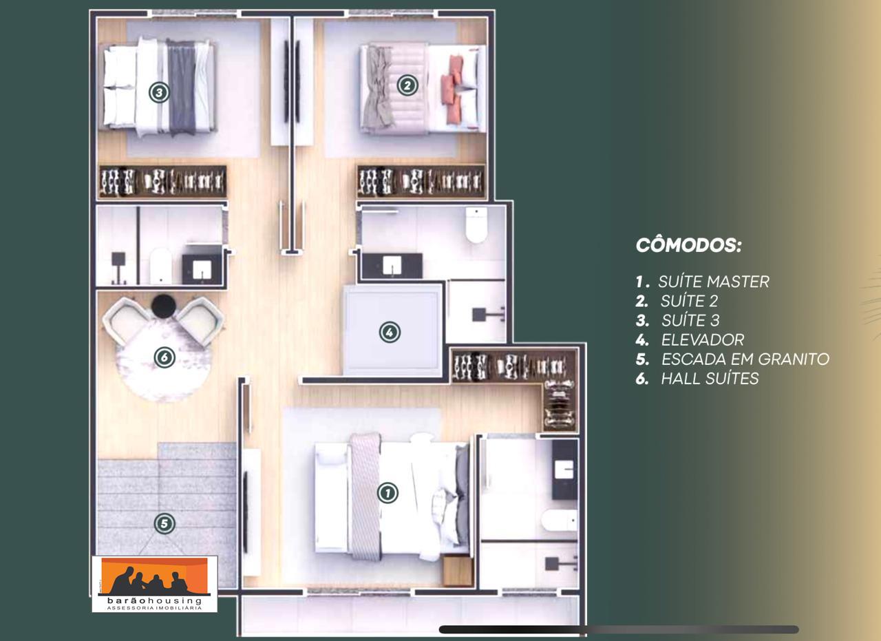 São 3 suítes, 1 lavabo, sala de estar e jantar, cozinha, área de serviço e quintal.