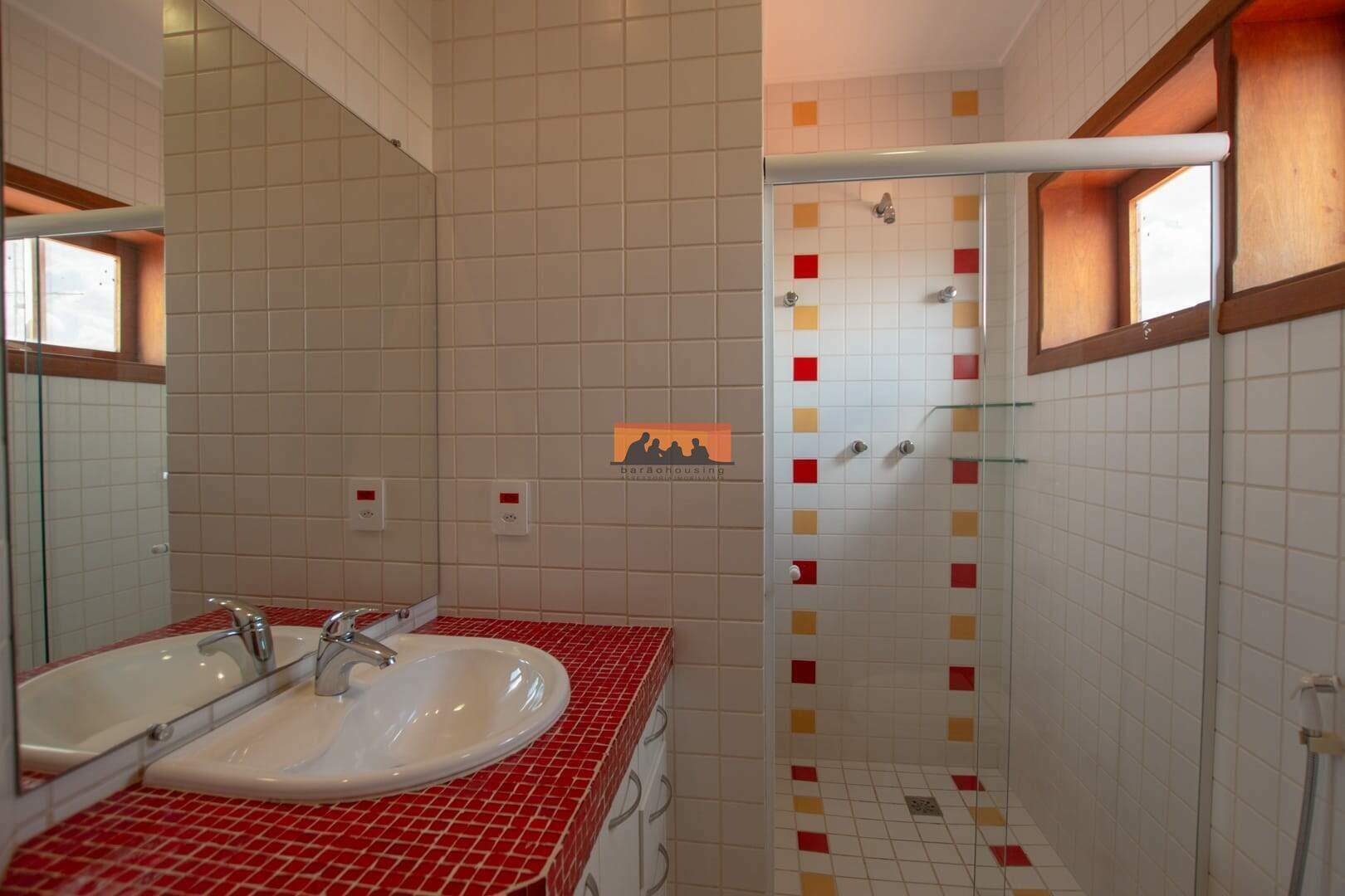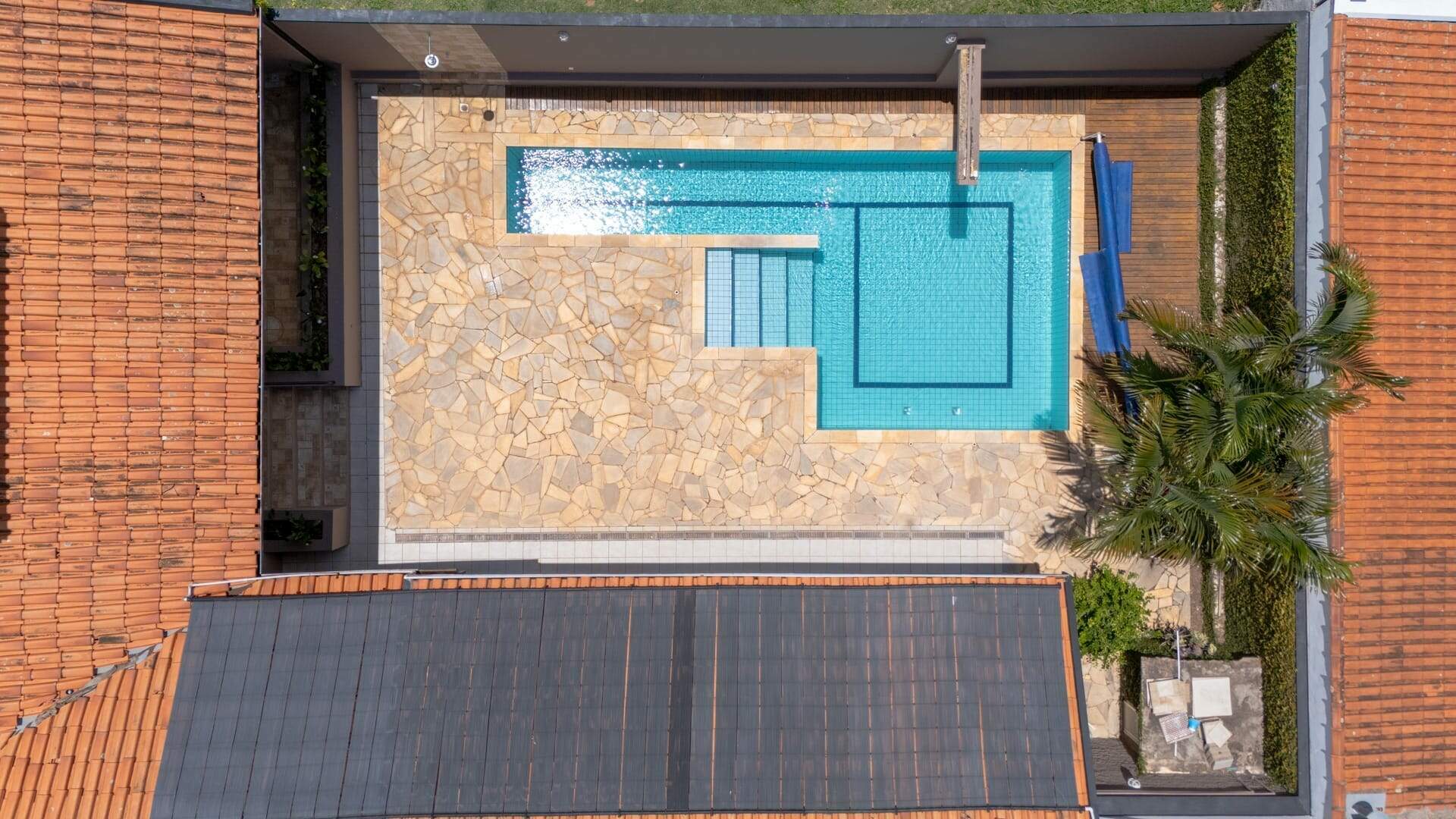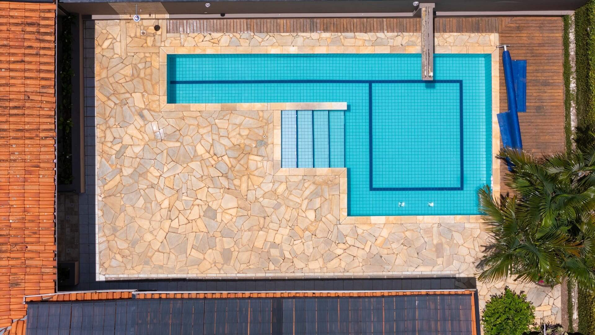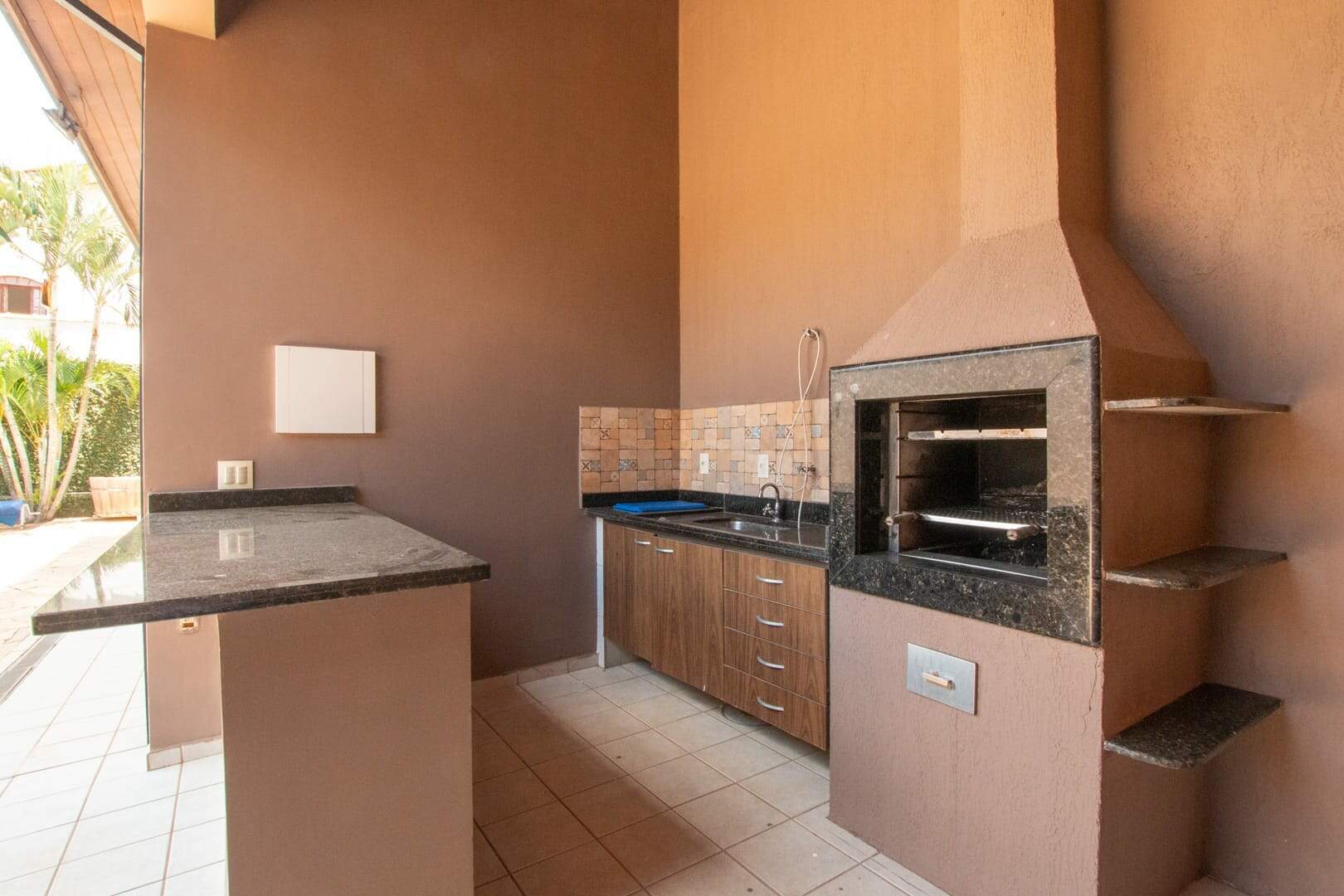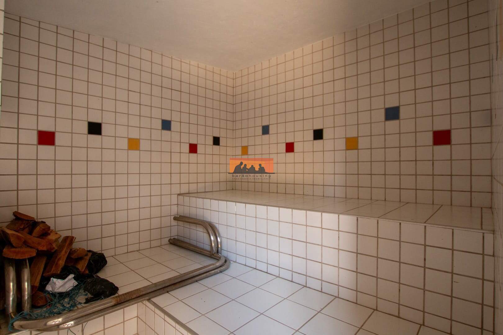Área Gourmet com churrasqueira piscina, lavabo e sauna.