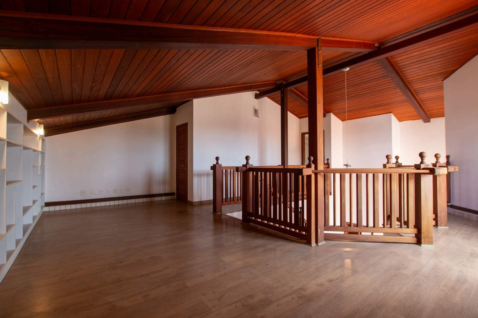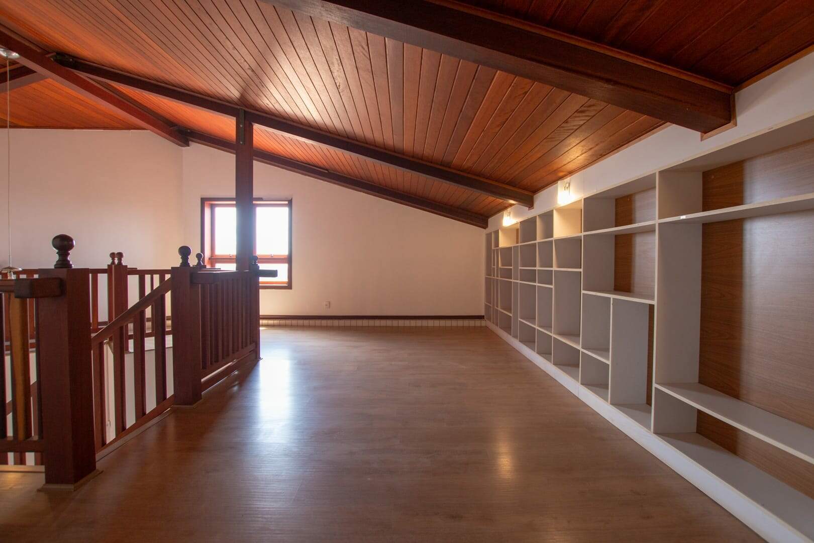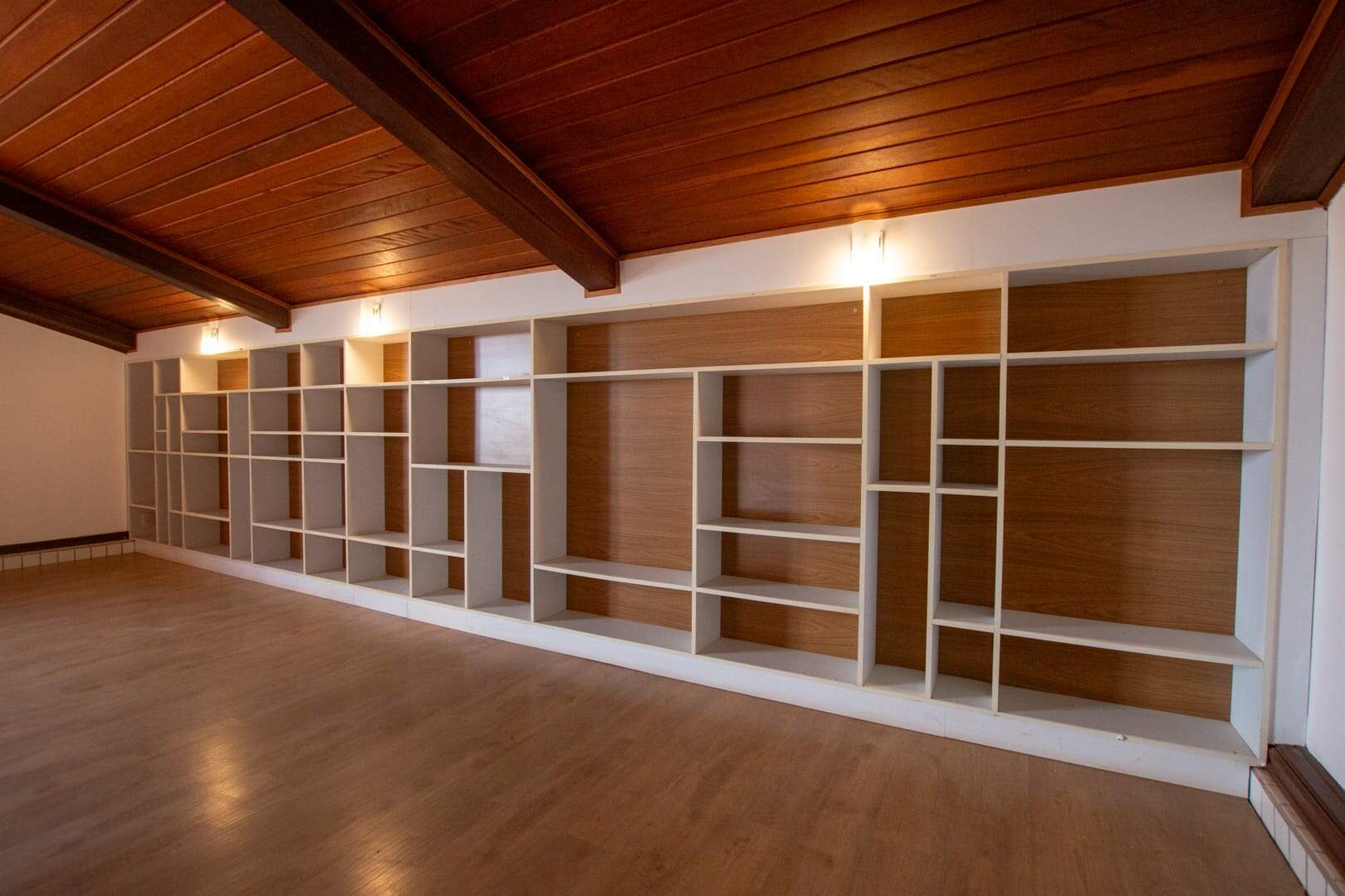 Mezanino com estantes: um espaço versátil com armário, ideal para escritório ou biblioteca.