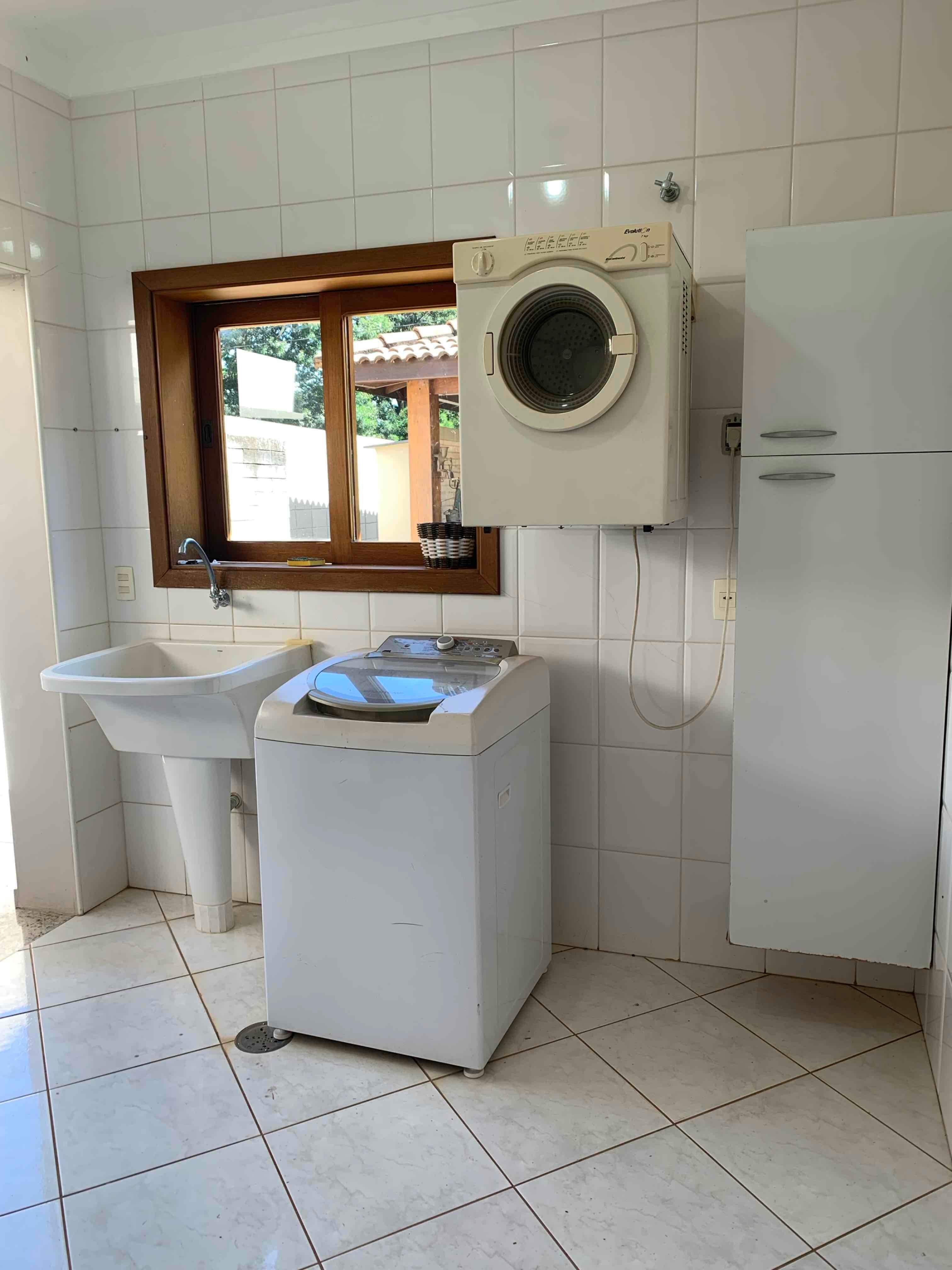 O imóvel conta com 3 quartos, sendo 1 suíte com closet, cozinha equipada com armários planejados e ampla sala para dois ambientes. A lavanderia é coberta e dispõe de máquina para secar roupas, além de despensa prática para armazenamento.