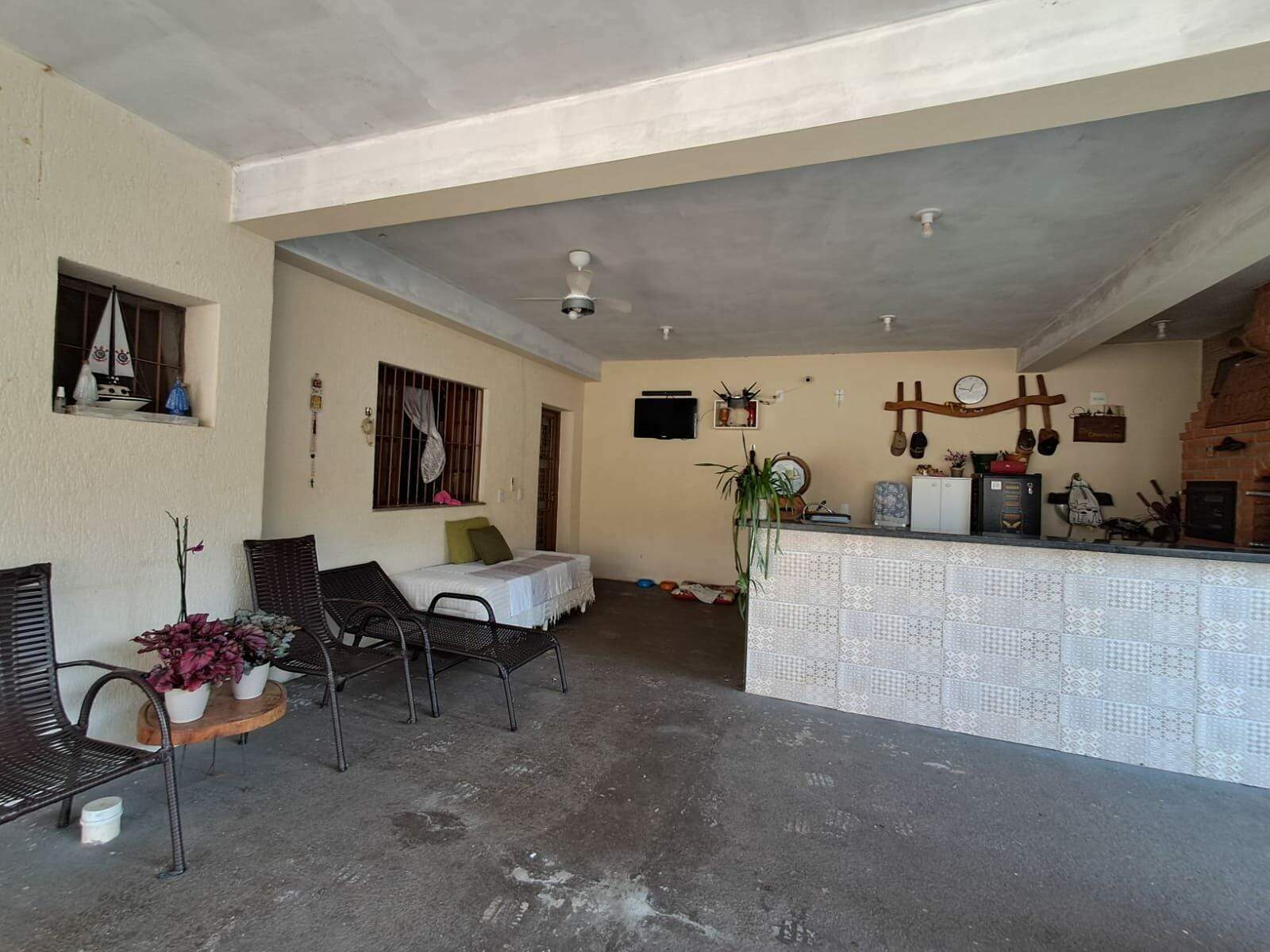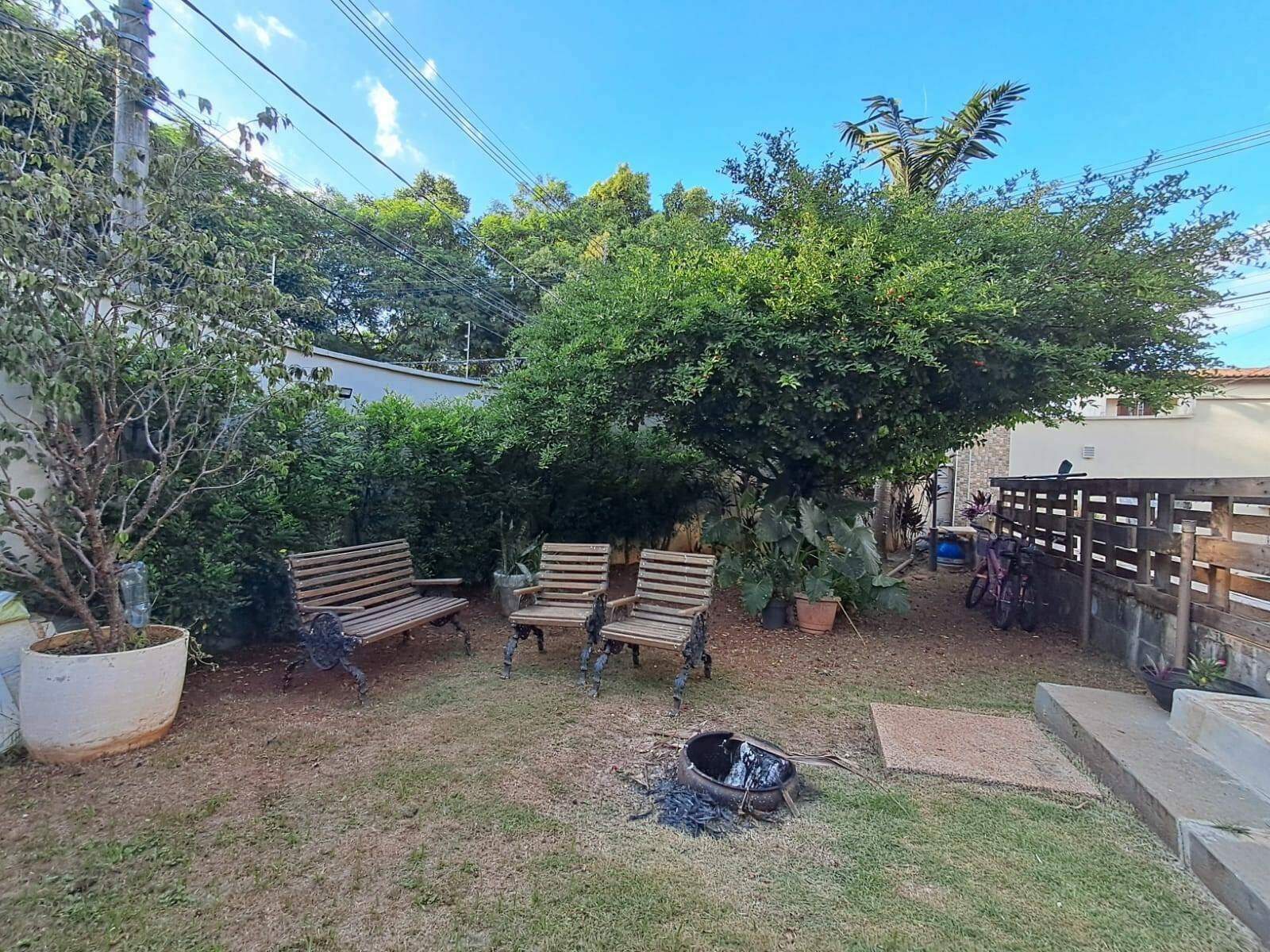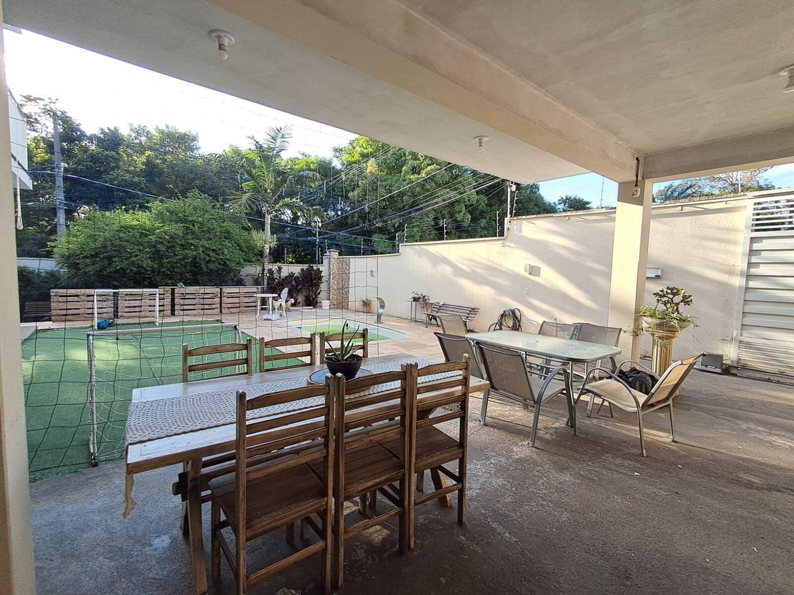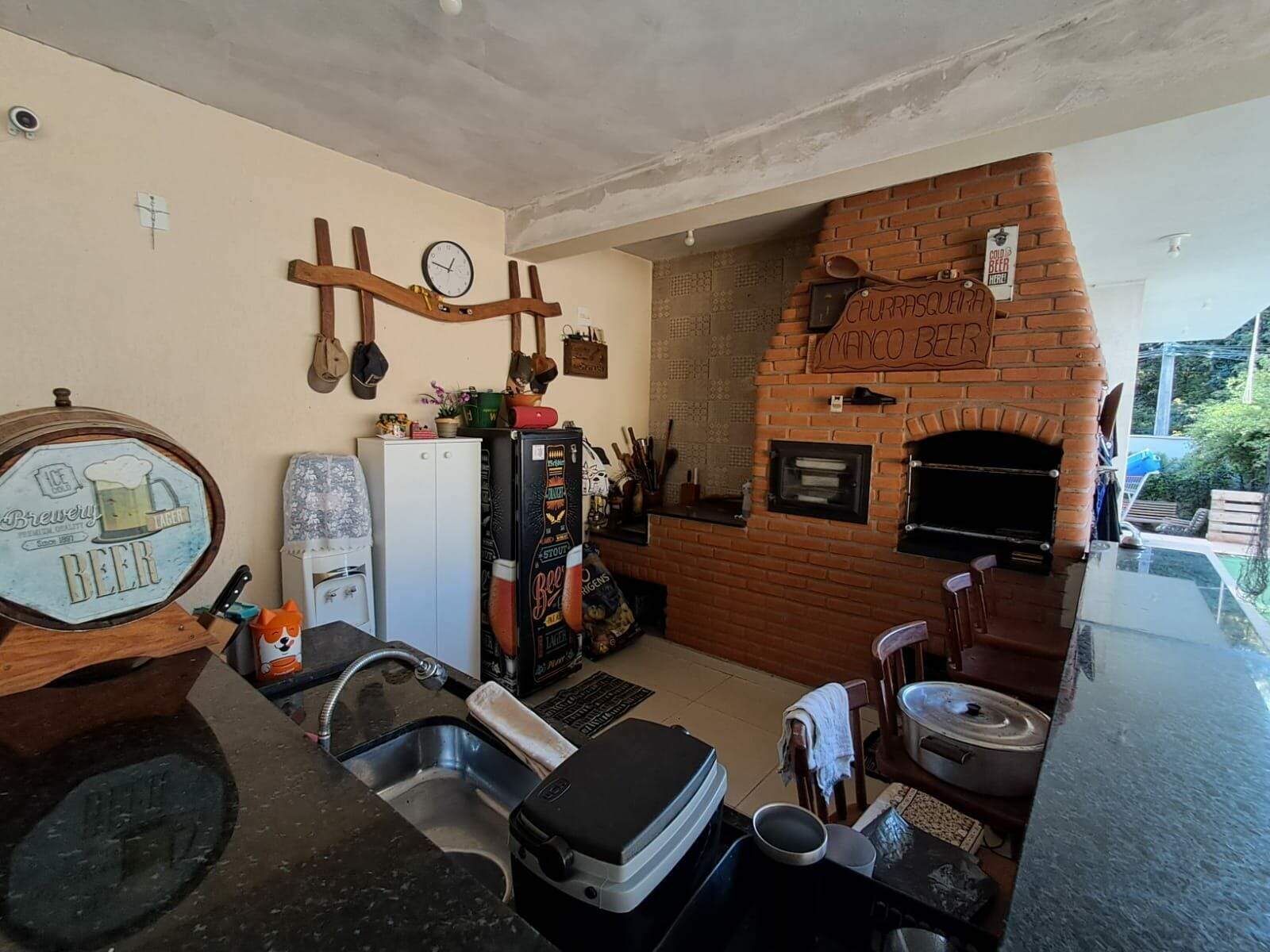 O imóvel conta com 4 suítes, sendo 1 suíte master com closet, 2 salas, cozinha espaçosa, área de serviço e área de churrasqueira equipada com fogão a lenha e forno. Além disso, dispõe de um banheiro social, um quarto adicional, piscina, mini campo de futebol e uma área verde com pés de acerola, jabuticaba e outras plantas.